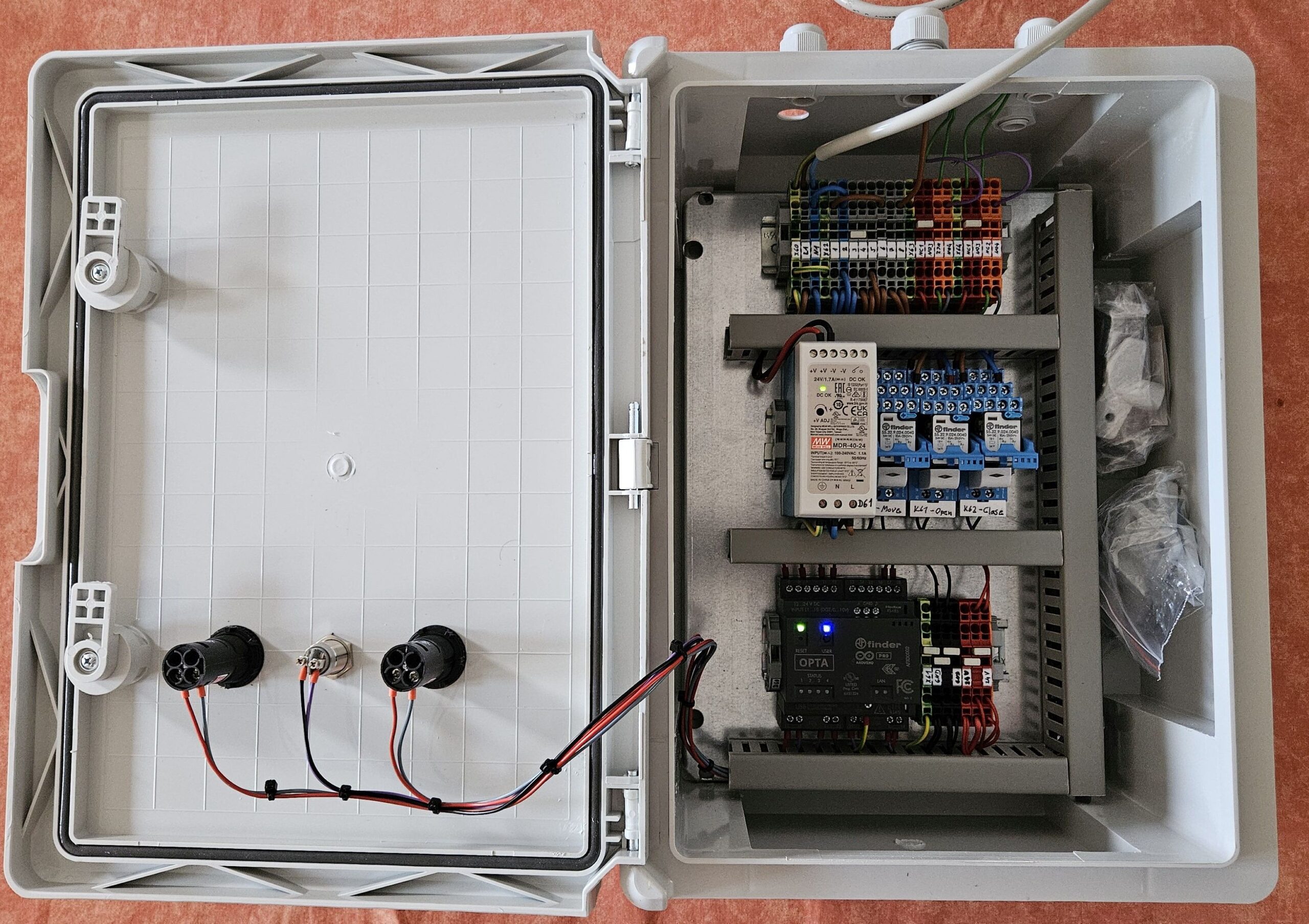Boitier basé sur un automate programmable (Arduino OPTA Wifi) qui commande le moteur 230VAC/1P/0.18 kW (Unitec SEMKg 63-4C) du cimier soit en manuel, soit en remote par le réseau.