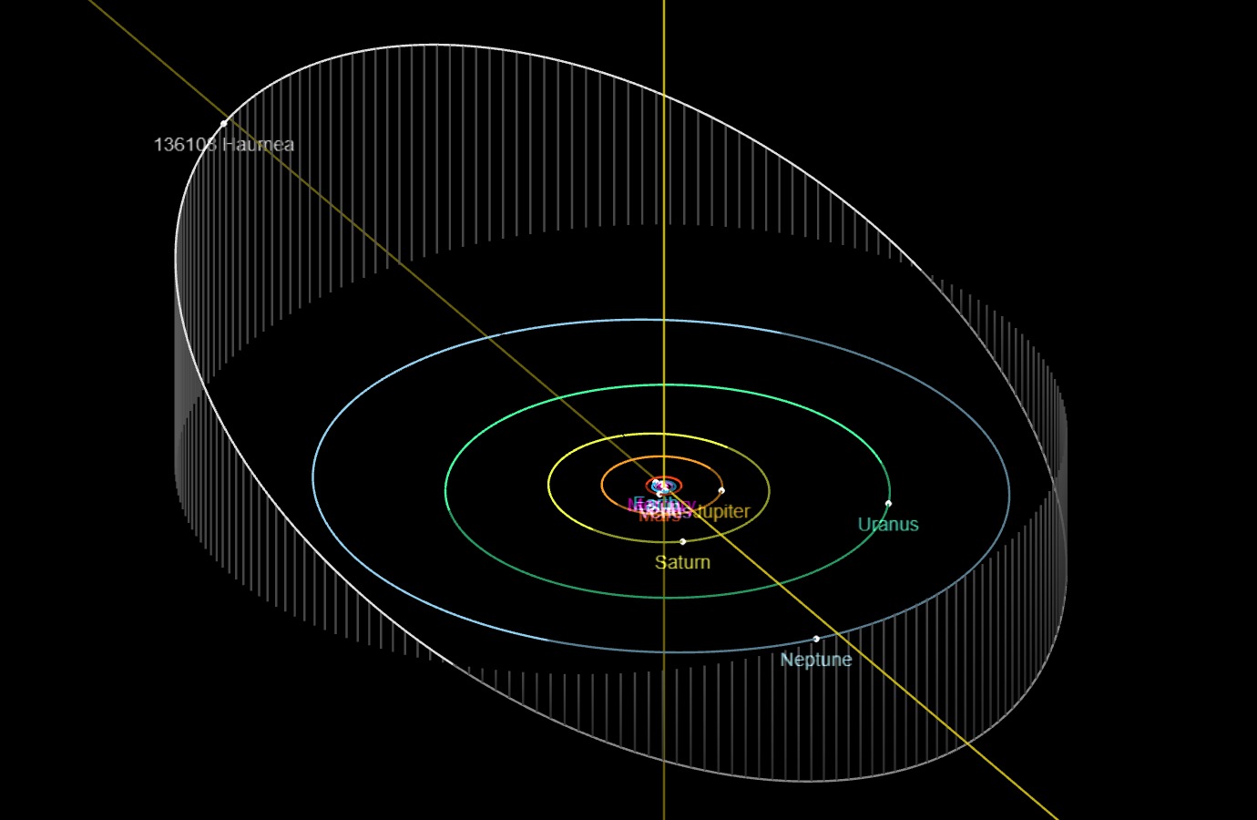 Dimension de 2’100 x 1’680 x 1’074 km avec 2 lunes Hiʻiaka et Namaka. Elle tourne sur elle-même en 3.9h d’où sa forme de ballon de rugby et en 284 années autour du Soleil.