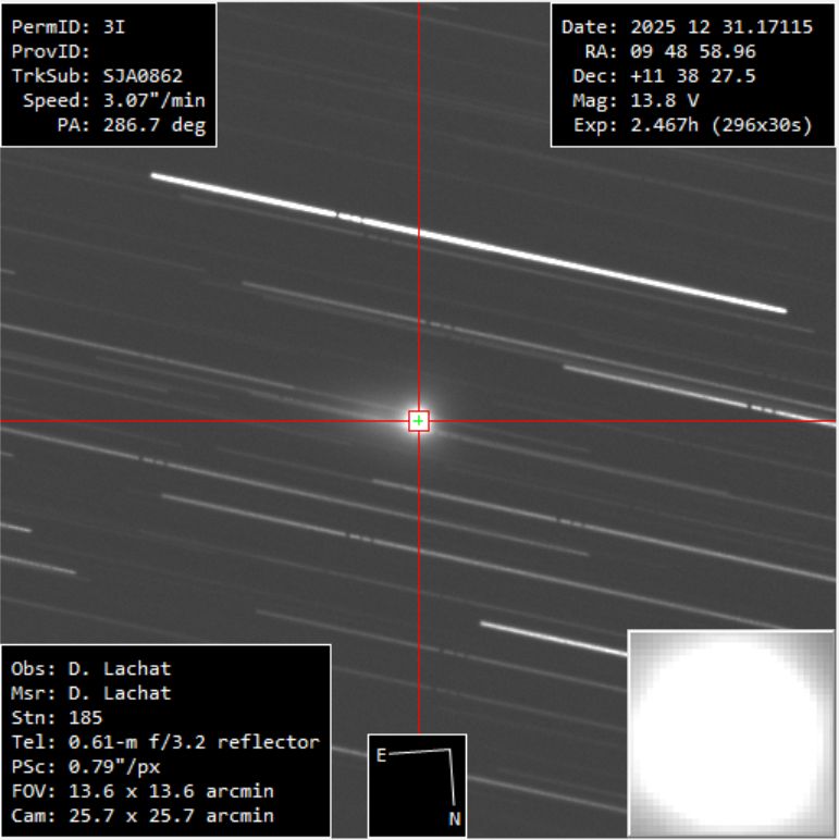 | 2025-12-31T02:57:40Z | 3I/ATLAS | C/2025 N1 | Interstellar comet | 0.3-5.6 km | 3 (3"/min) | ASI6200MM-Pro / BIN2 | 296x30s / 3h25 | SJA0862 | 13.6 V | D. Lachat | cmt/pct queue | |