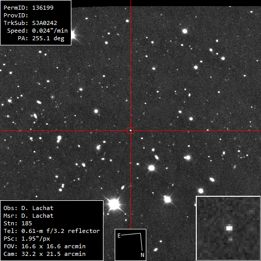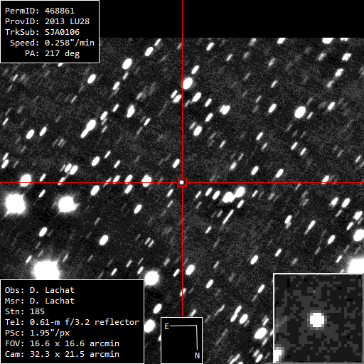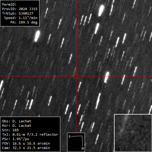| 2026-01-20T21:38:11Z | 360081 | 2013 BJ16 | Hungaria | 850 m | 3 | ASI6200MM-Pro / BIN5 | 100x30s / 1h08 | SJA0943 | 19.3 V | D. Lachat | Publi pending | |