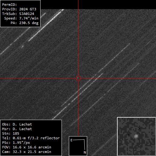| 2024 01 21.01863 | 395898 | 2013 AN52 | Main Belt | 3.1 km | 3 | ASI294MM-Pro / BIN8 | 25x90s / 0h54 | SJA0031 | 19.6 V | D. Lachat, L. Erard | MPS 2111100 | |