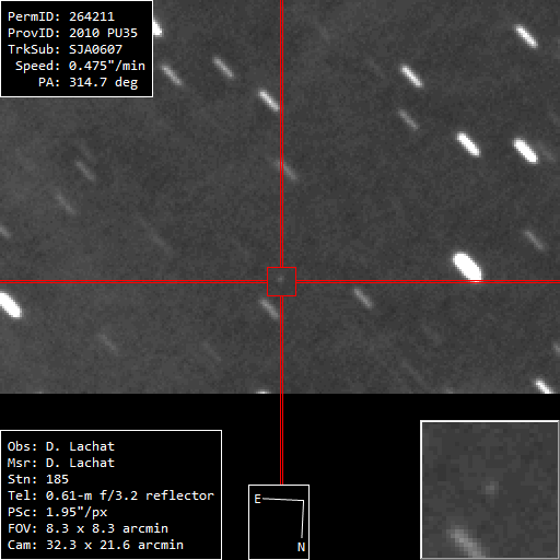 | 2026-01-26T19:50:14Z | 347045 | 2010 EU122 | Main Belt | 1.2 km | 3 | ASI6200MM-Pro / BIN5 | 100x30s / 1h08 | SJA0980 | 20.2 V | D. Lachat | Publi pending | |