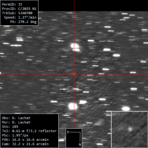 Découverte par ATLAS le 1er juillet 2025, la comète interstellaire 3I/ATLAS a été observée le lendemain de sa découverte avec le TBC61, aidant ainsi à affiner son orbite atypique (hyperbolique). Avec une vitesse de 61km/s à cette date, plus que la vitesse de libération du Soleil et une excentricité de plus de 6 (donc une trajectoire hyperbolique), on sait qu’elle ne vient pas de notre système solaire. Les observations depuis Vicques figurent dans la circulaire MPEC 2025-N22 du MPC. L’estimation actuelle de la taille est de 24km, mais le noyau devrait être autour des 5km. Après l’astéroïde 1I/Oumuamua (A/2017 U1) en octobre 2017 et la comète 2I/Borisov (C/2019 Q4) en août 2019, c’est seulement le troisième objet interstellaire observé !