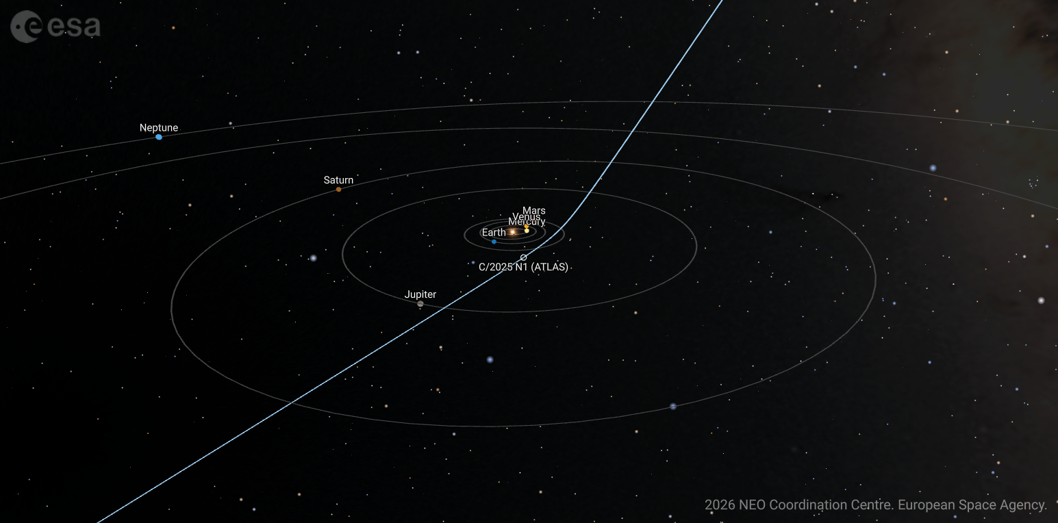 La comète interstellaire 3I/ATLAS est en train de quitter notre système solaire pour toujours à la vitesse d’environ 60 km/s. Les dernières mesures faites avec Hubble estiment son cœur à maximum 5.6 km de diamètre. Le télescope spatial SPHERE a mesuré sa queue d’environ 700’000 km très riche en CO2.