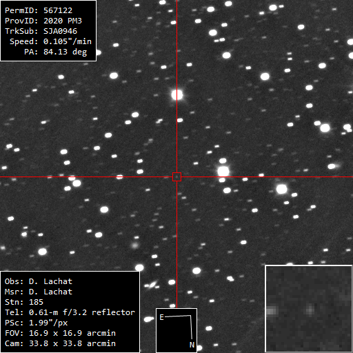 | 2026-01-21T19:24:35Z | 567122 | 2020 PM3 | Centaur | 2 | 59 km | 2 (0.12"/min) | ASI6200MM-Pro / BIN5 | 180x30s / 2h03 | SJA0946 | 20.5 V | D. Lachat | Publi pending |
