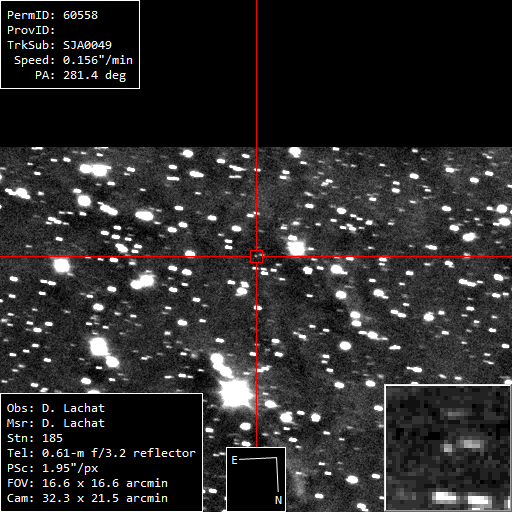 | 2026-01-26T19:50:14Z | --- | 2016 SP87 | Main Belt | xxx | 3 | ASI6200MM-Pro / BIN5 | 100x30s / 1h08 | SJA0983 | 20.6 V | D. Lachat | Publi pending | |