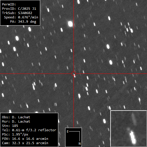 Découverte par Gennadiy Borisov depuis son observatoire en Crimée (IAU L51), la comète appelée temporairement « gb00795 » dans la NEOCP/PCCP et a été mesurée avec le TBC61 la nuit du 13 au 14 mai 2025, aidant ainsi à affiner son orbite, elle se trouvait à ce moment-là pratiquement au pôle nord céleste. Elle est devenue « C/2025 J1 (Borisov) » le 17 mai avec le MPEC 2025-K05.