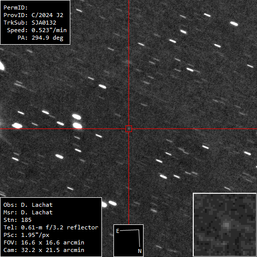 Initialement posté sur la liste NEO PCCP du MPC sous la dénomination « CALRCC2 » par le Mt. Lemmon Survey (IAU G96) avec une magnitude 21.0 V, elle a été mesurée à Vicques deux jours plus tard, le 13 mai 2024 aidant au calcul de son orbite et à sa dénomination dans la circulaire MPEC 2024-K31 où figurent nos mesures. Une deuxième nuit de mesure a été faite le 19 mai 2024 avec le TBC61.