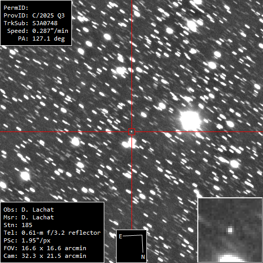 Découverte par le programme ATLAS avec le télescope de Schmidt de 0.5m nommé « HKO » (IAU T05) depuis Haleakala à Hawaï. La comète a été appelée temporairement « A11rtVp » dans la liste NEOCP/PCCP et a été mesurée avec le TBC61 les nuits du 25 au 26 août, du 17 au 18 septembre et du 3 au 4 octobre 2025, aidant ainsi à affiner son orbite. Elle est devenue « C/2025 Q3 (ATLAS) » le 15 octobre avec le MPEC 2025-T165. Faits intéressants, cette comète a une excentricité de 0.997 et une inclinaison de 90.186 deg, c’est donc une visiteuse qui vient directement du nuage de Oort !